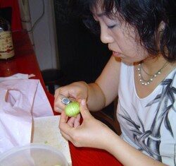 開店前の仕込みの時間にワイフが小玉ネギ(ペコロス)の皮をむいています。「小玉ネギシェリービネガー漬け」はウイスキーやシェリーに良く合い、酸味...