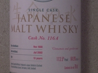 1988年蒸溜のモルト 6つ目はなんとこれです 116.4 ( Yoichi ) 1988年10月蒸溜 2002年7月瓶詰 13年もの 64.9% SMWSのリストに書かれたコメントは「シ...