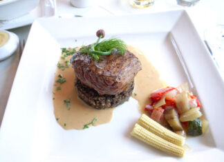 メインディッシュは、アイラ牛のフィレ肉ステーキ(レア)のハギス添え。 アイラ島でもご馳走中のご馳走だと思います。 たっぷりの肉汁。ハギスには全然臭みがありません。これは驚きです。少し脂っこい程度...