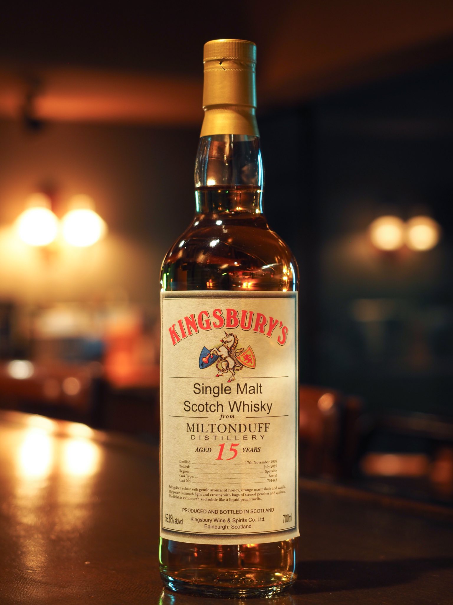 日記 BAR THINK 2026年3月11日 ミルトンダフ MILTONDUFF 2009-2025 14y.o 57.8% Cask Type : Barrel Cask No.701443 KINGSBURY [テイスティングノート] 淡いゴールドのウイスキーからは、はちみつ、オレンジマーマレード、バニラがやさしく香る。口にするとなめらかで軽く、煮込んだ桃やアプリコットがたっぷり感じられるクリーミーな質感。フィニッシュはやわらかくなめらかかつ繊細で、ピーチメルバを飲んでいるような感覚。 シェア FacebookTwitterLINEEmail この記事を書いた人 BAR THINKhttp://barthink.sakura.ne.jp/ この著者の記事 日記 カリラ 日記 王林のシャルロッカ 日記 イチゴのカクテル 日記 休業のご案内 日記 山崎&白州 日記 柚子のカクテル 前の記事キャンベルタウンモルト~猫バーの新入荷ボトル~次の記事カリラ