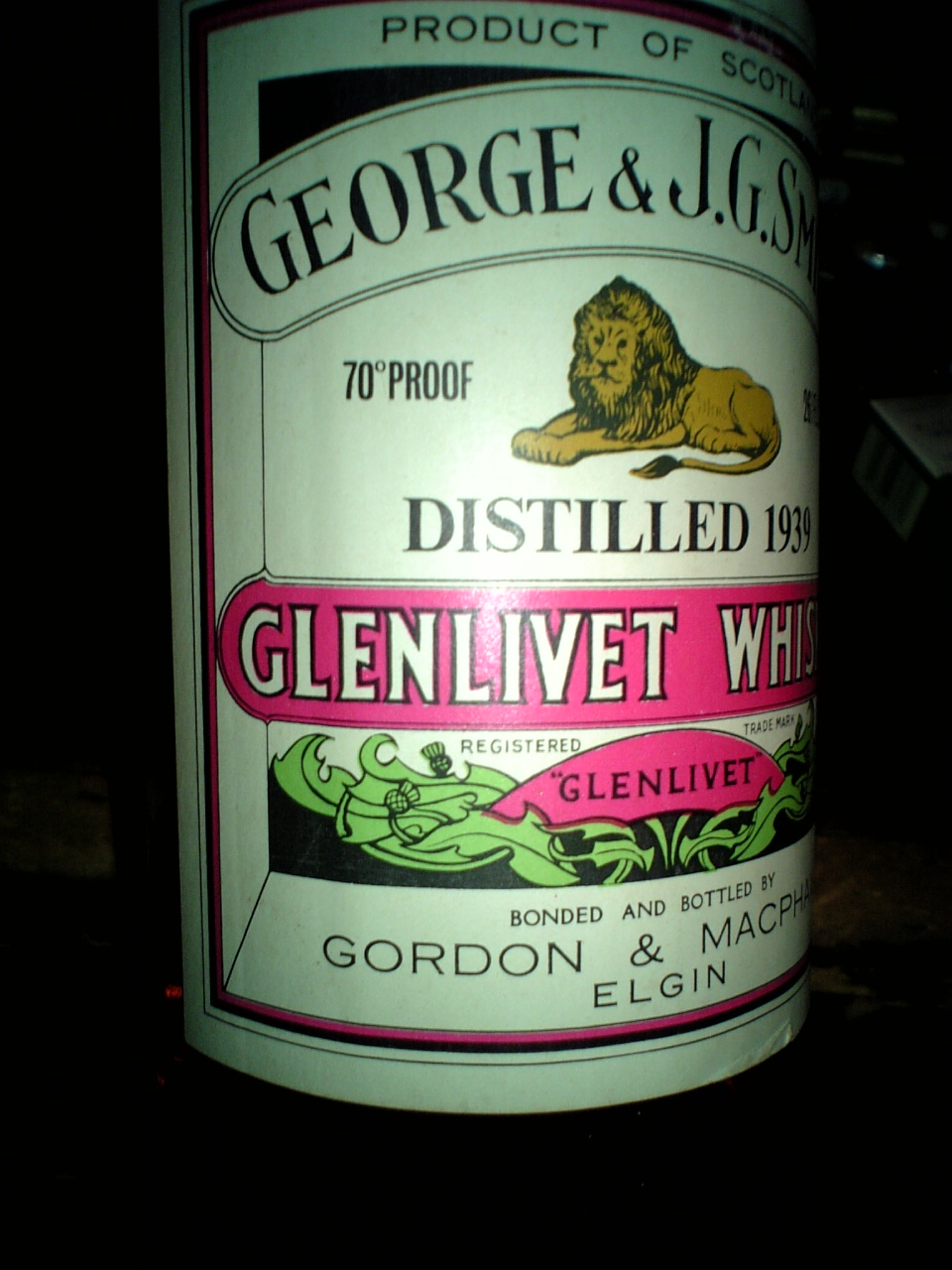 GMが自らの知名度を頂点に持っていった歴史的ボトル。日本通称:スミスのライオンリベット。GMは1930年代以降の樽を多数保持しており、 ・Glenlivet 50y 1946-1996 40%, G&M 1996年発売 など、50年熟成ものも存在する。1939年蒸留においても、48年熟成 が80年代後半にリリースされている。 【1939年の出来事】 ・ドイツがポーランドに侵攻したことによって欧州では第二次世界大戦が勃発した。 このデザインのボトルにおいて熟成年数表示は、ライオンの下部分に記載されるか、ネック部分に別ラベルを貼付した形で提供されている。本ボトルにそれらはなく、各資料においても熟成年数未記載、ボトリング年未記載のボトルが複数リリースされていたことが確認できた。蒸留年のみを表示し瓶詰め年や熟成年を表示しないというのは今ではあまりないことだ。 戦前戦中に蒸留された極めて歴史的価値の高いボトルに敬意を表したい。 |