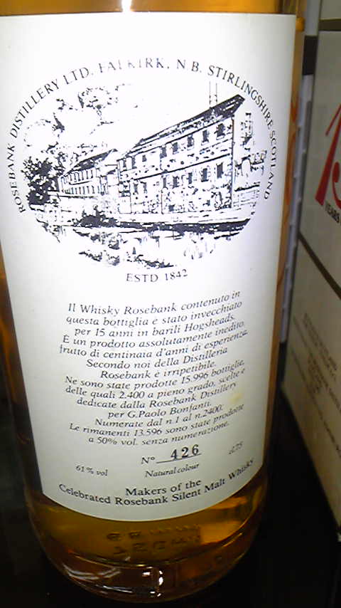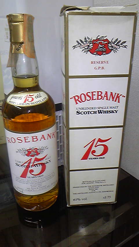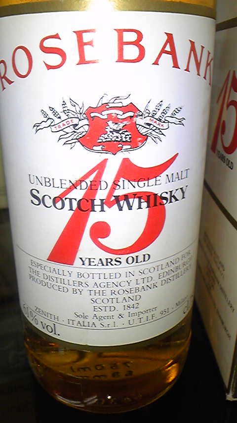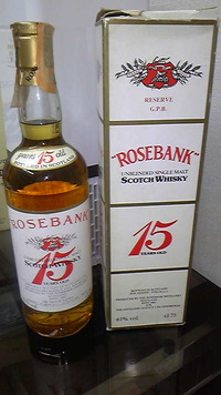 Brand: Rosebank – 15 years old Description: Zenith import – Clear glass – White label printed in red & black, age printed in big character |