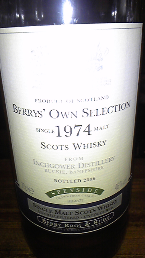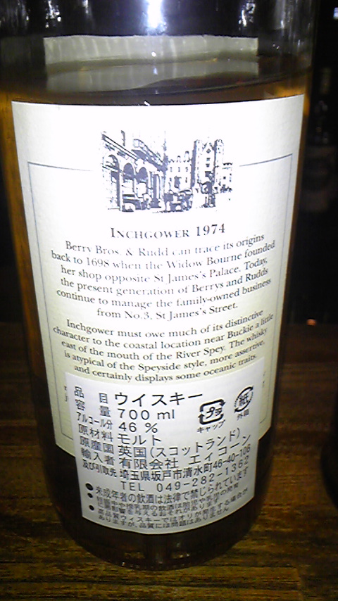 BBRは1698年ロンドンで食料雑貨業を創業。16世紀エリザベス女王から王室御用達の勅許状を受けた。創業以来本店所在地も同じ。 インチガワはベルの主要モルトである。1871年アレキサンダー・ウィルソンにより創業。その際施設設備を閉鎖されたTochieneal(トチニール)蒸留所から移設したという。1936年~1938年までバッキー町議会が所有権を保有した。1938年アーサー・ベル・アンド・サンズがベルの原酒確保のため同蒸留所を購入。仕込み水はメンダヒルズの泉。現在の所有はディアジオ。 インチガワ蒸留所の近くにある丘は有名な密造者”マクファーソン”の住処があった。彼は蒸留器を巧みに隠していたのだが、あるとき数頭の牛が隠し場所に侵入、覆っていた芝を食べてしまい、バレてしまったという。 マスターから上質なインチガワとのコメント。 |