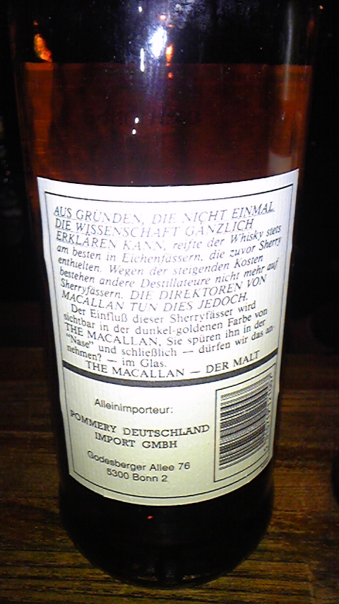 当ブログのキーモルト。ドイツ周りのこの1本は、当時の日本向けと同一レシピなのだろうか。だいぶおいしい。8/15にこのマッカランを飲んで以降、以前より高得点が出ていないのはご存知のとおり。。。ただこの1本との比較というよりは、さまざまなシチュエーションで飲んできた同一ラベルを総合的に指標とさせていただきたいと思う。 マスターからお聞きできたマッカランの見分け方:ラベル周囲内側の線、黒は80年代、金色は90年代以降リリース。 |