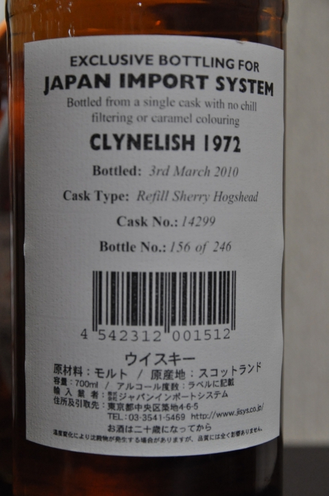 1969-1973まではブローラがアイラスタイルのヘビーピーテッドウイスキーを仕込んでいた時期に符号します。その点この樽はクライネリッシュで間違いがないといえます。