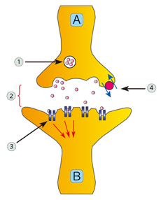 「クロニンジャーのパーソナリティ理論」![]() シナプス前細胞(A)から後細胞(B)への神経伝達物質伝達(from Wikipedia) ①神経伝達物質が詰まったシナプス小胞 ②シナプス間隙を拡散する神経伝達物質 ③後シナプス細胞の受容体 ④神経伝達物質のトランスポーター |