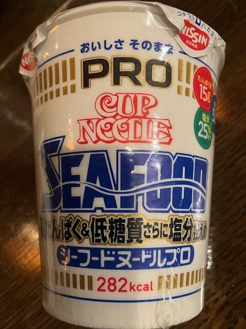 で?このところ深夜にも関わらず、魔改造シリーズをコンプリートし、カロリーや糖質、塩分をお構いなしに摂取してしまったので、反省してカップヌードルプロにしておりますが、今日はシーフードヌードルはシーフードヌードルでもプロバージョンにしてみました![]()