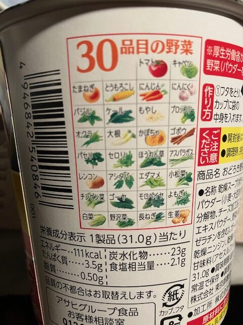 昨夜はヘルシーやろうというイメージで1日分の野菜が入ってるらしい、おどろきカップスープをチョイスしましたが、これはある程度食うても肥えへんやろ