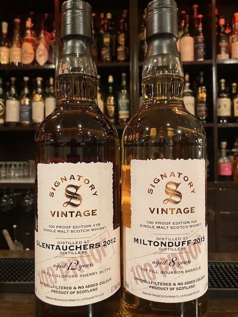 グレントファースは2012年ビンテージの12年熟成で、ファーストフィルオロロソシェリーバット熟成、ミルトンダフは2015年ビンテージの8年物で、ファーストフィルバーボンバレル熟成、いずれも57.1%の100ブリティッシュプルーフのノンチルノンカラーでボトリングされています。