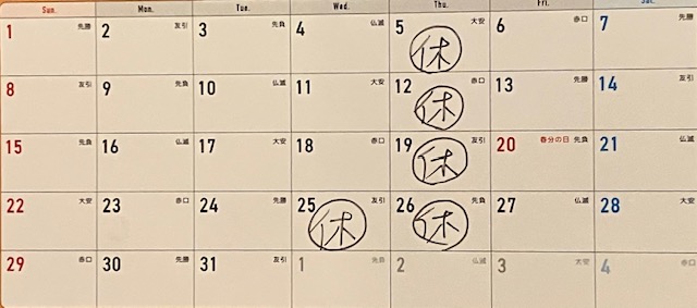 3月は以上の5日間をお休みさせて頂きます