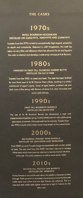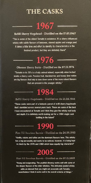 バーボン樽やシェリー樽、長熟のトマーティンから若さ溢れるトマーティンまで、多彩な個性が融合し、「穏やかだが記憶に残る男」といわれる、キャンベル氏そのもののような風味を生み出している。ノンチルフィルター、46%でのボトリング。