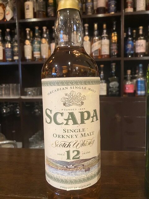 オークニー諸島メインランドにあるスコットランド最北端の蒸溜所のハイランドパークより南に2km程の所に位置するスキャパ蒸溜所のこのボトルはサントリーが輸入、広告を手掛けていた1990年代に流通していたオールドボトルで、洋梨のフレーバーが印象的なアイランズモルトです